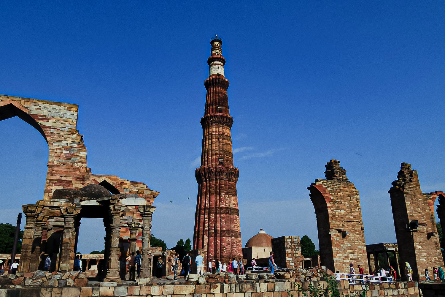 Qutab Minar - built in red sandstone during the early 13th century and standing 72.5 m tall, tapering from 2.75 m in diameter at its peak to 14.32 m at the base, it is not only one of the tallest towers of its time but the tallest brick tower in the world. The tower is ornamented with intricate stone carvings and the walls consist of verses from the Koran (the holy book of Islam). The Complex also hosts mosques and a 5th/ 6th-century BC Iron Pillar (in the courtyard of the mosque) which has not rusted even after 2000 years.